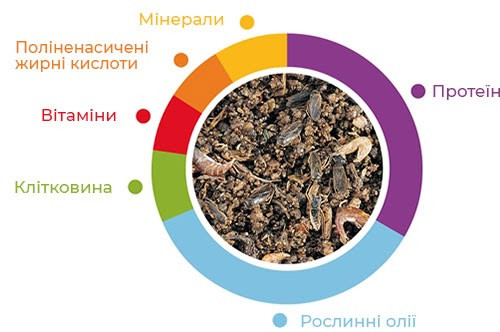 | Склад | Злаки, бисквіт, олії і жири, субпродуктори рослинного походження, екстракти білків з овочів, фрукти (ягоди можвейника 0,5%, яблуко 0,5%, цукру (мед 1%), мінерали, молюски і ракоподібні (квітки 2%), сорбіт, комахи (водні мухи 0,5%) |