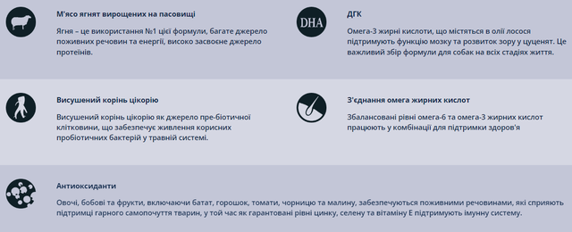 Склад: ягнятина, борошно з м’яса ягняти, батат, яєчні продукти, сочевиця, горох, борошно з гороху, олія каноли, картопля, висушені дріжджі, смажена ягнятина, томатні вижимки, олія лосося (джерело ДГК), мінерали, висушений корінь цикорію, томати, чорниця, малина, екстракт Юкки (Yucca schidigera).